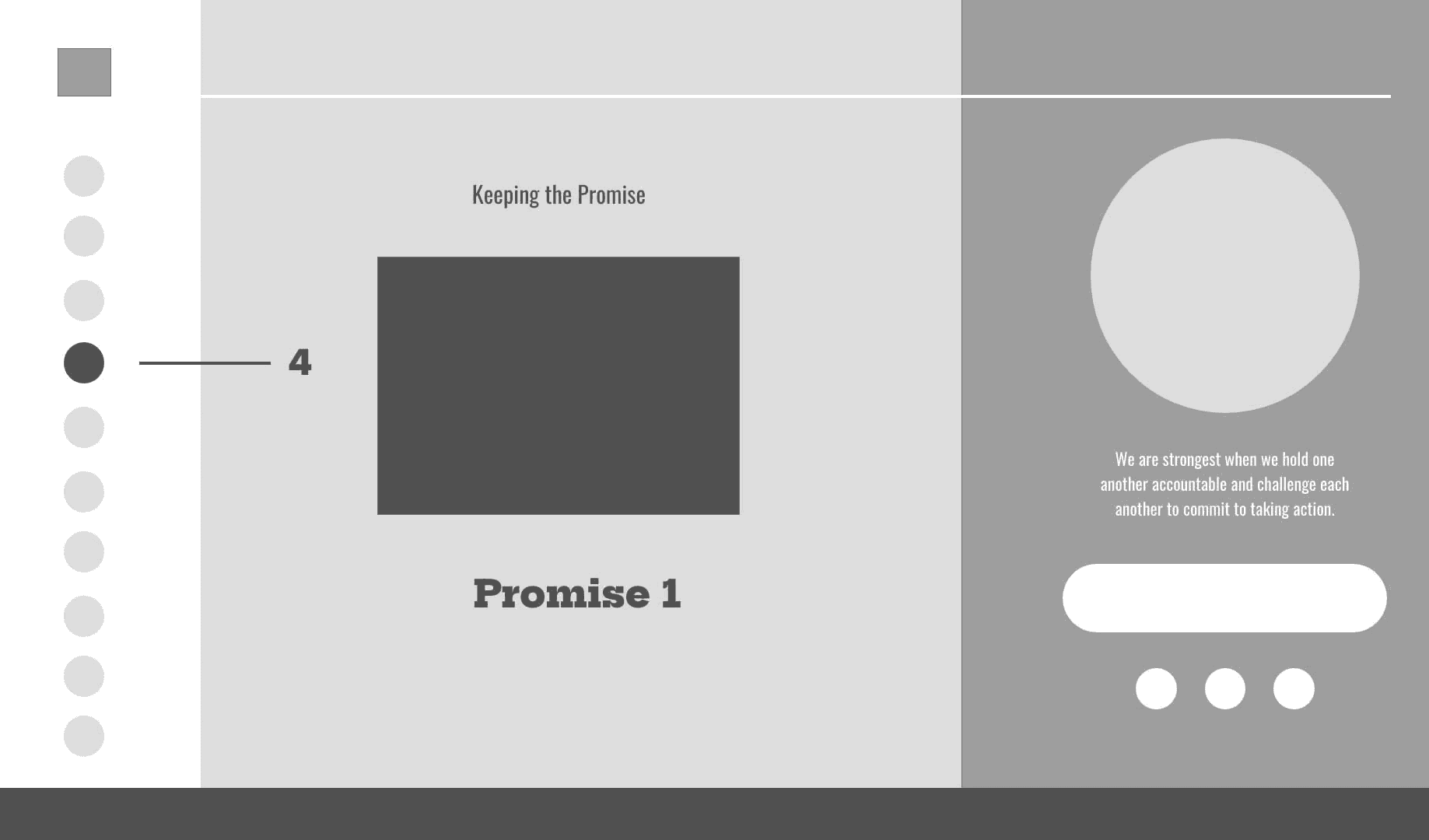 Each of these challenges kicked my design process into emergency problem-solving gear, which gave me the idea of having the navigation be front and center. This would allow the user to focus on just one Promise at a time, limiting the color palette, and give a little more heft to the project in place of data. Additionally, this allowed the dev team to simply copy and paste code for each of the 12 Promises, instead of having to customize each one for functionality, and thusly streamline development time.